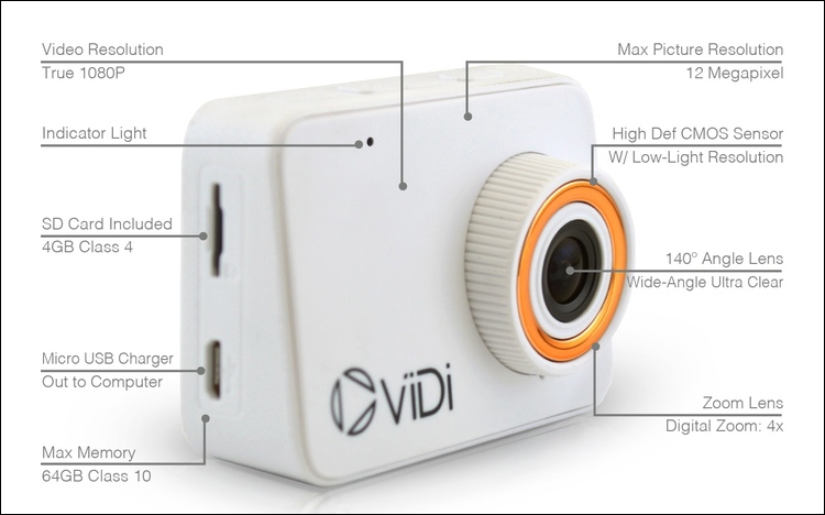 Компактное устройство позволяет делать 12-мегапиксельные фотоснимки, а также записывать видеоматериалы в формате 1080р (1920 × 1080 точек) со скоростью 30 кадров в секунду. Для хранения отснятого контента служит карта microSD (в комплект поставки войдёт носитель вместимостью 4 Гбайт).