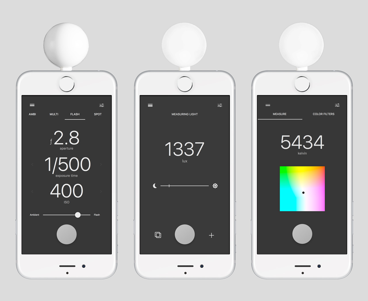 Эти возможности Lumu Power обеспечивают два датчика, расположенных с двух сторон насадки, которая имеет форму полусферы. Специальный фотодиод, выверенный по стандарту Международной комиссии по освещению CIE, измеряет уровень света, а датчик True Color, соответствующий стандартам в области цвета CIE 1931/DIN 5033, считывает цветовую температуру.
