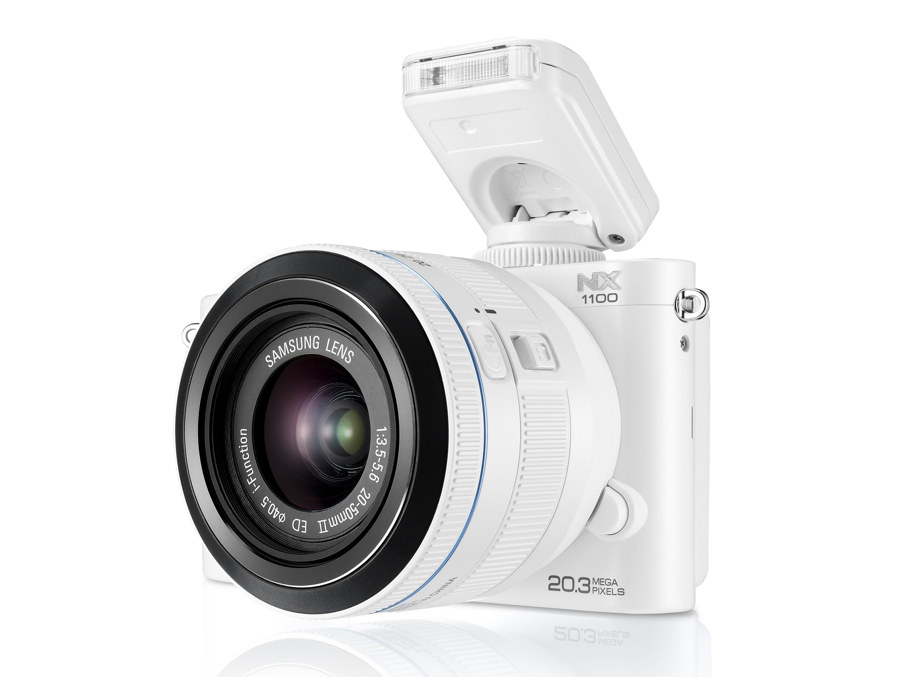 NX1100 оснащена 20 мегапиксельным КМОП-сенсором формата APS-C. Имеет большой 3-х дюймовый экран на 921 тысячу точек. Полноценный встроенный беспроводной интерфейс позволяет передавать фотографии на внешние устройства во каналу Wi-Fi. Последовательная съёмка — до 8 кадров в секунду, запись видео в FullHD. В комплекте к аппарату прилагается ПО Adobe Lightroom.
