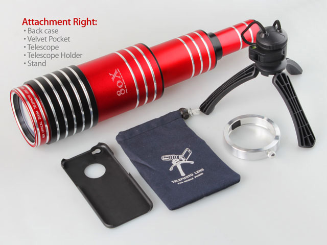 В набор входит объектив с 80-кратным зумом, небольшой штатив, крепежное кольцо, установочная задняя панель для смартфона, а также вельветовый чехол.